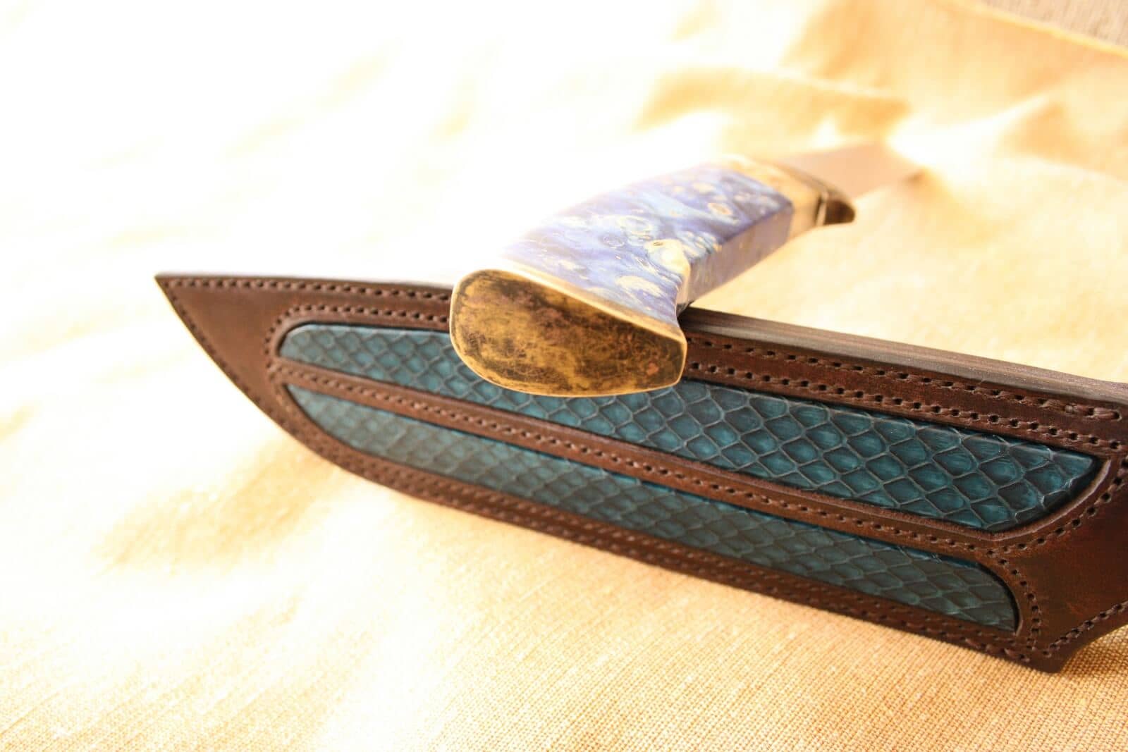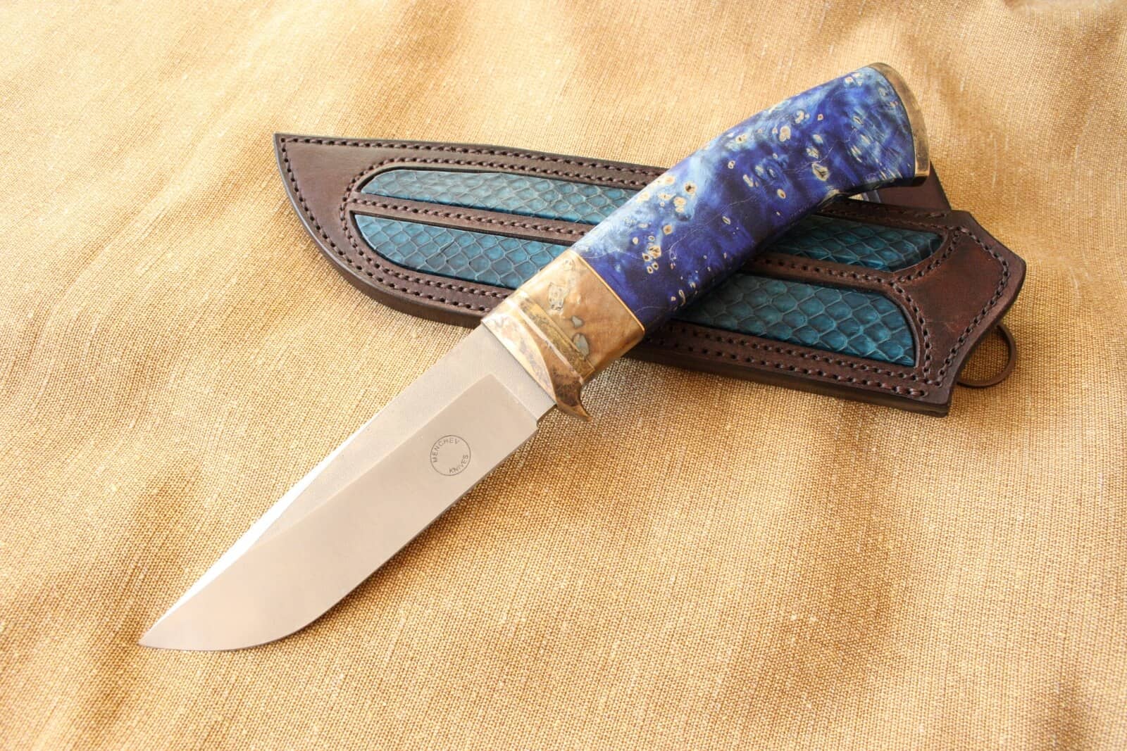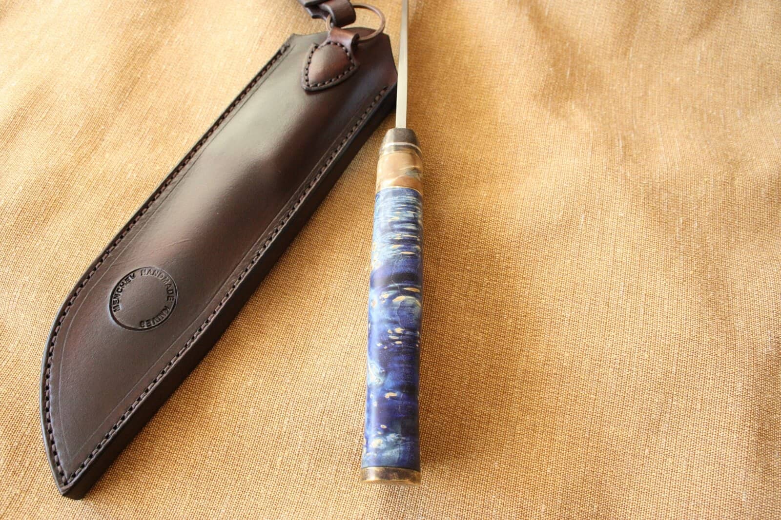 Elmax blade with custom patinated brass fittings, stabilized natural maple spacer and stabilized blue maple burl