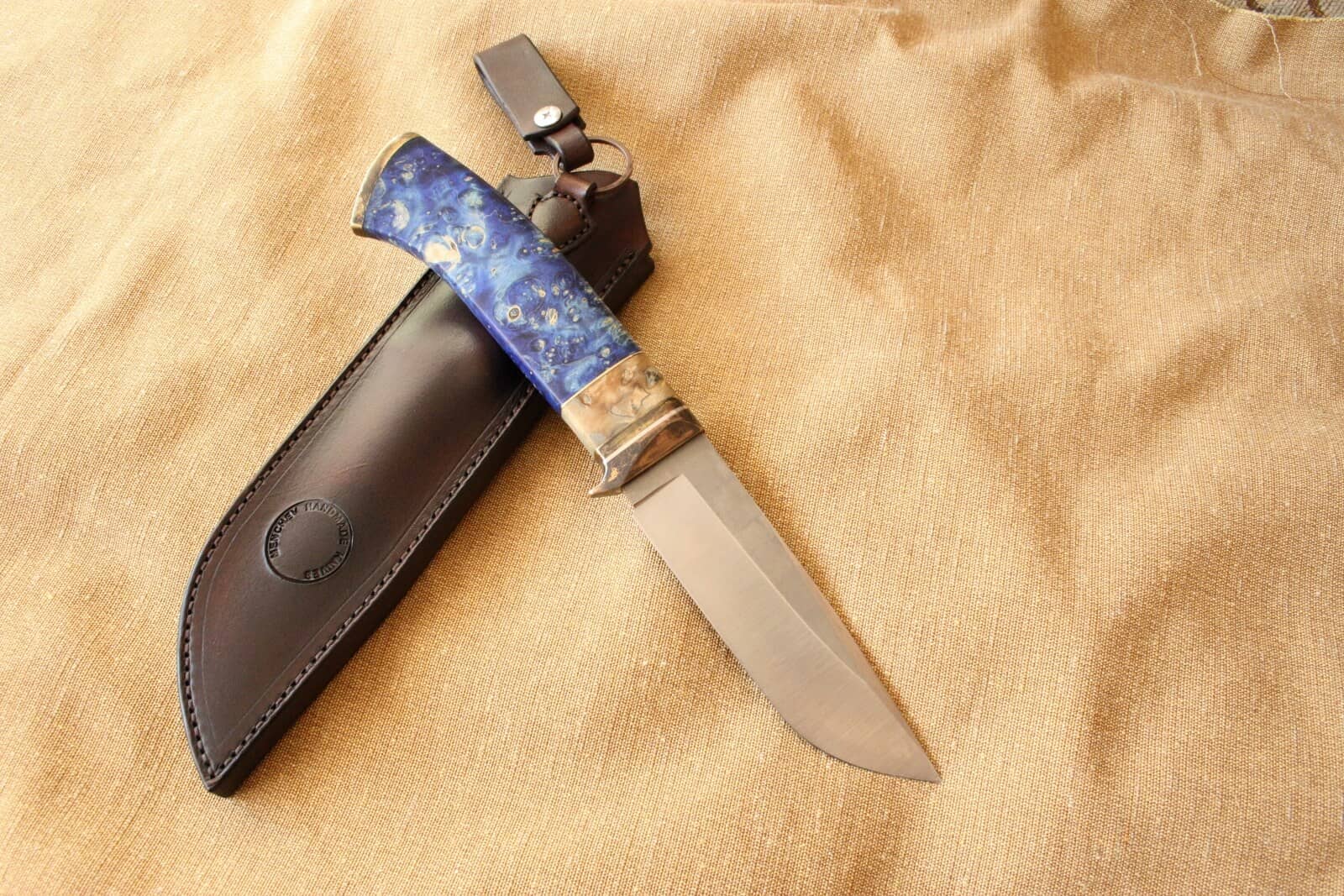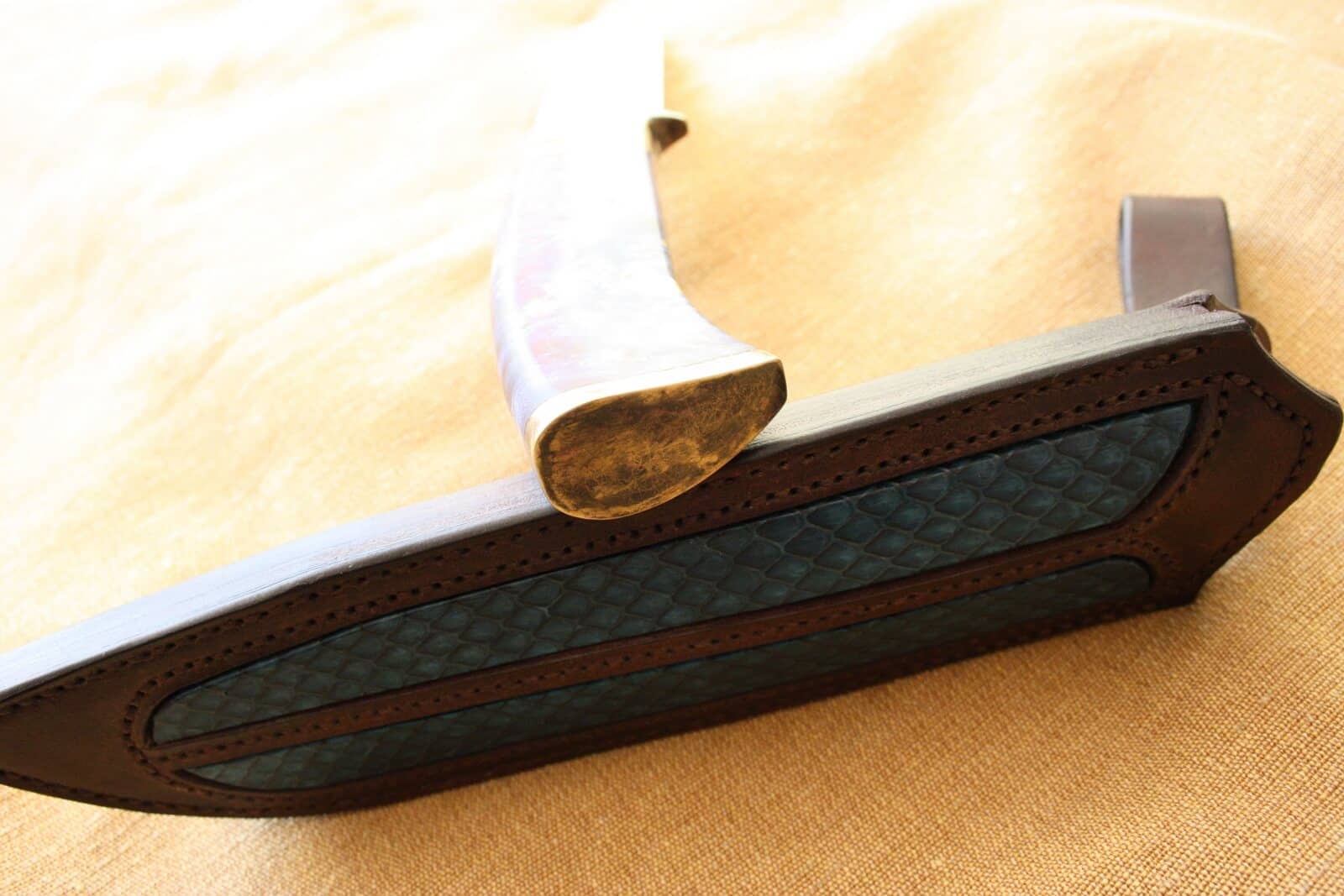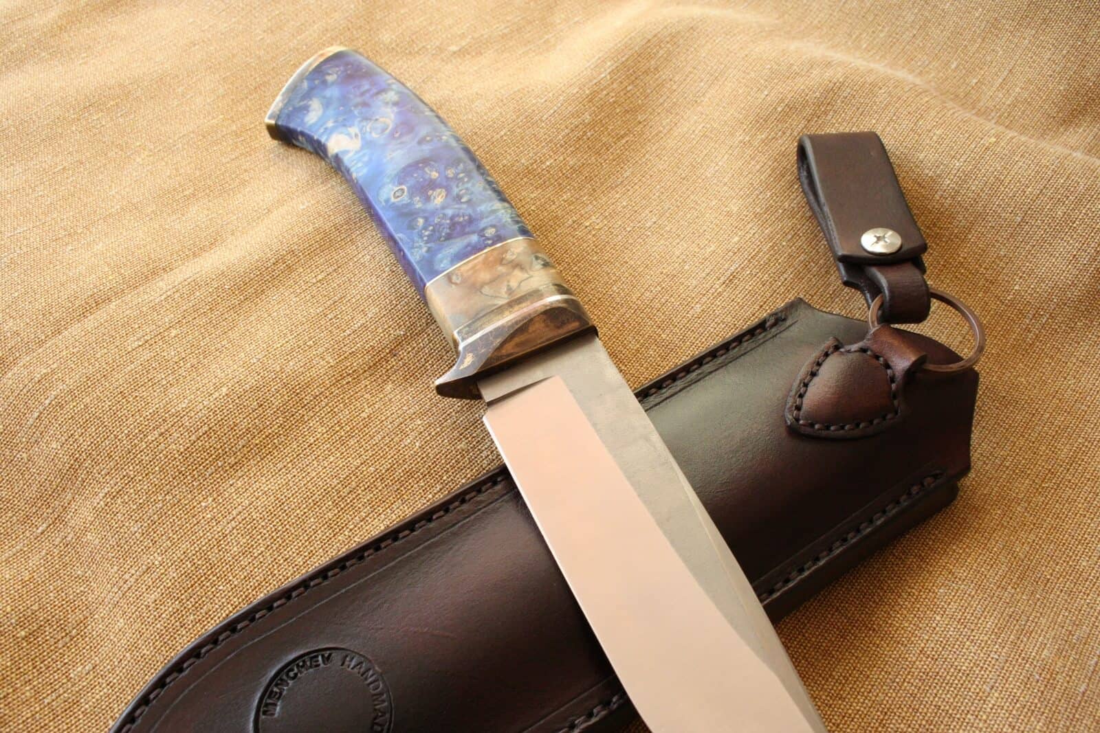 Elmax blade with custom patinated brass fittings, stabilized natural maple spacer and stabilized blue maple burl