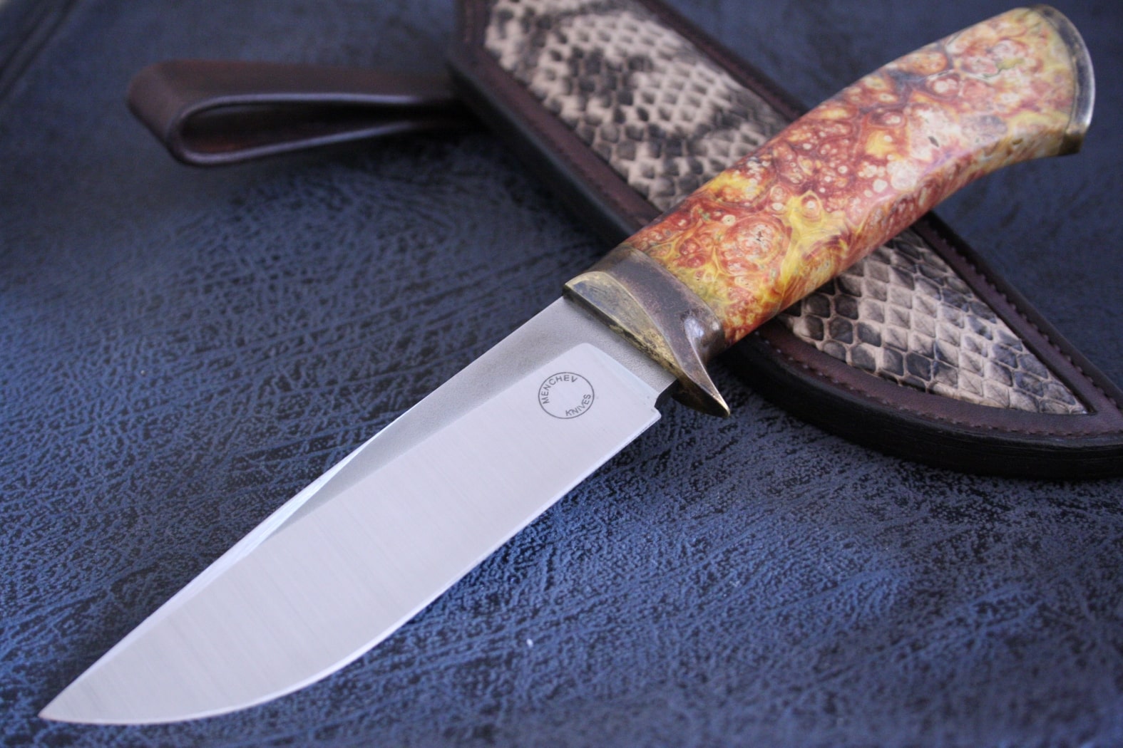 Vegetable tanned leather sheath with python skin inlay