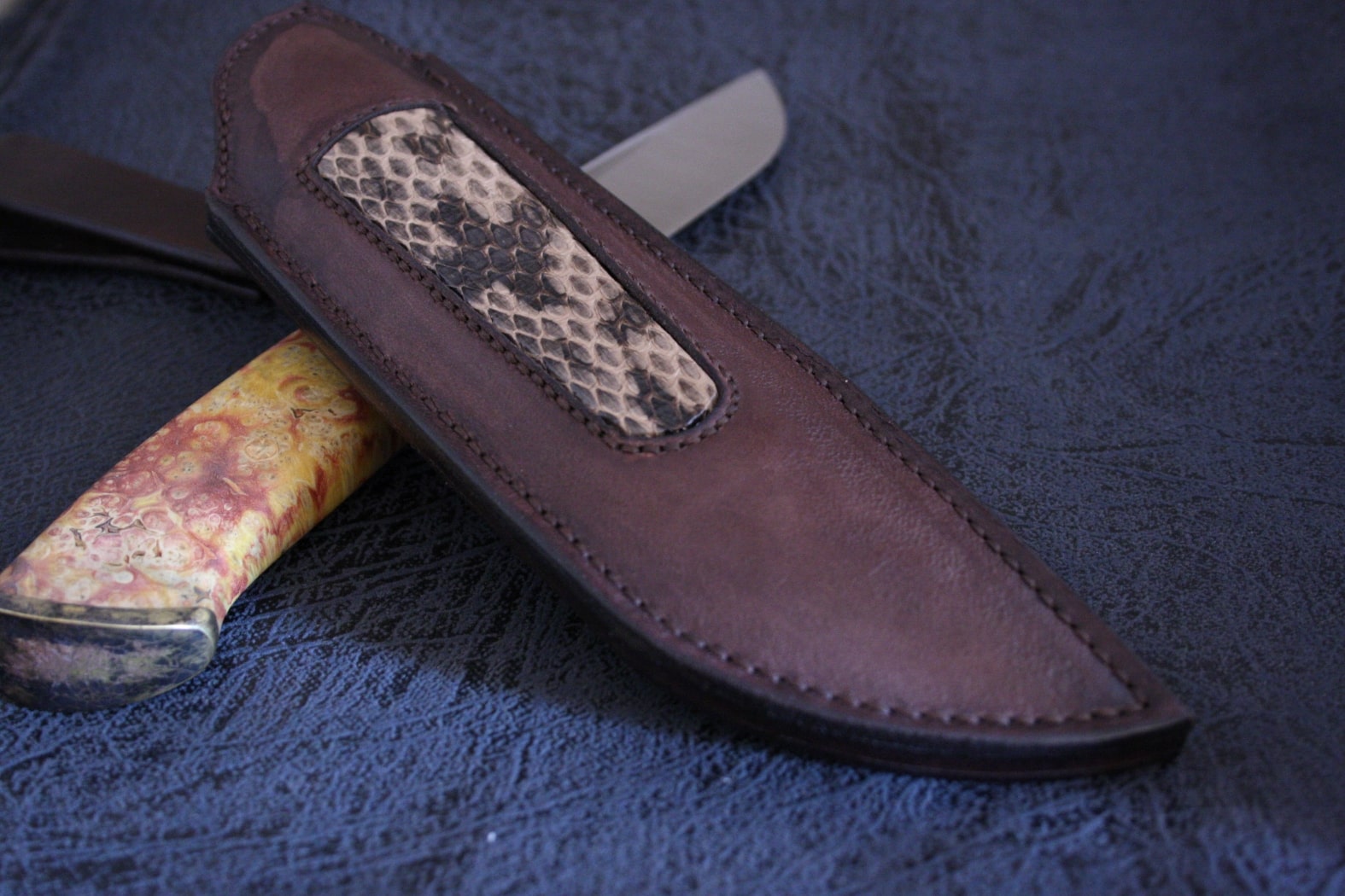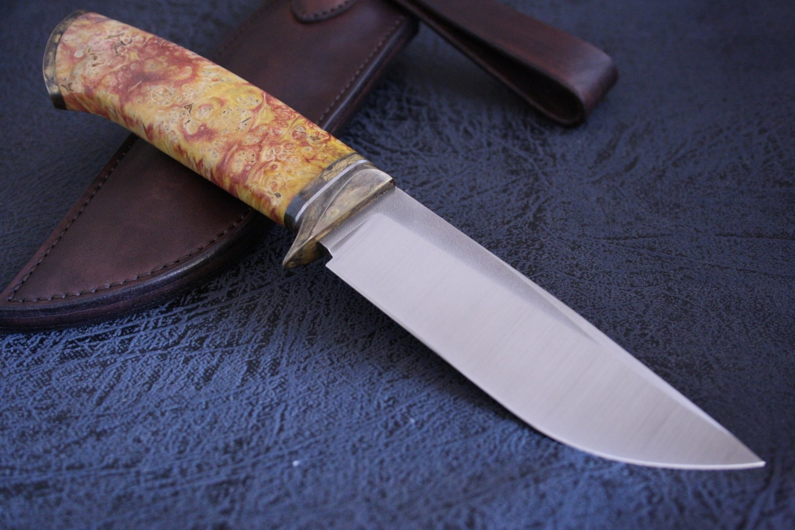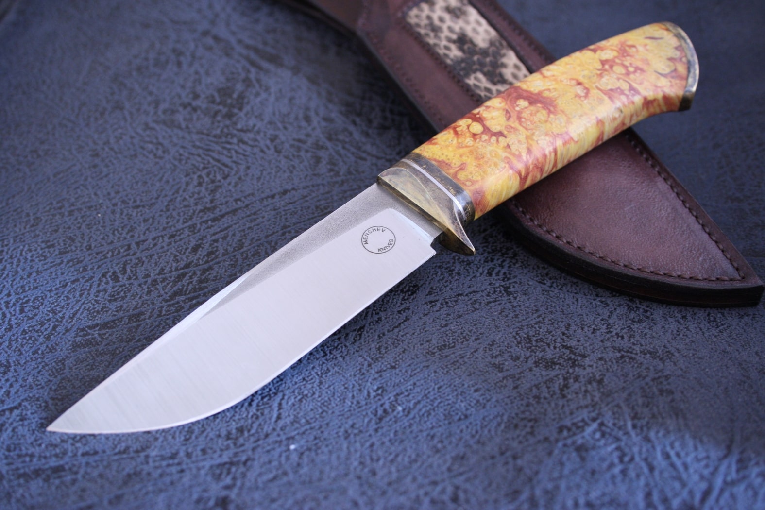 RWL34 blade with custom patinated brass fittings, stabilized yellow – red maple burl