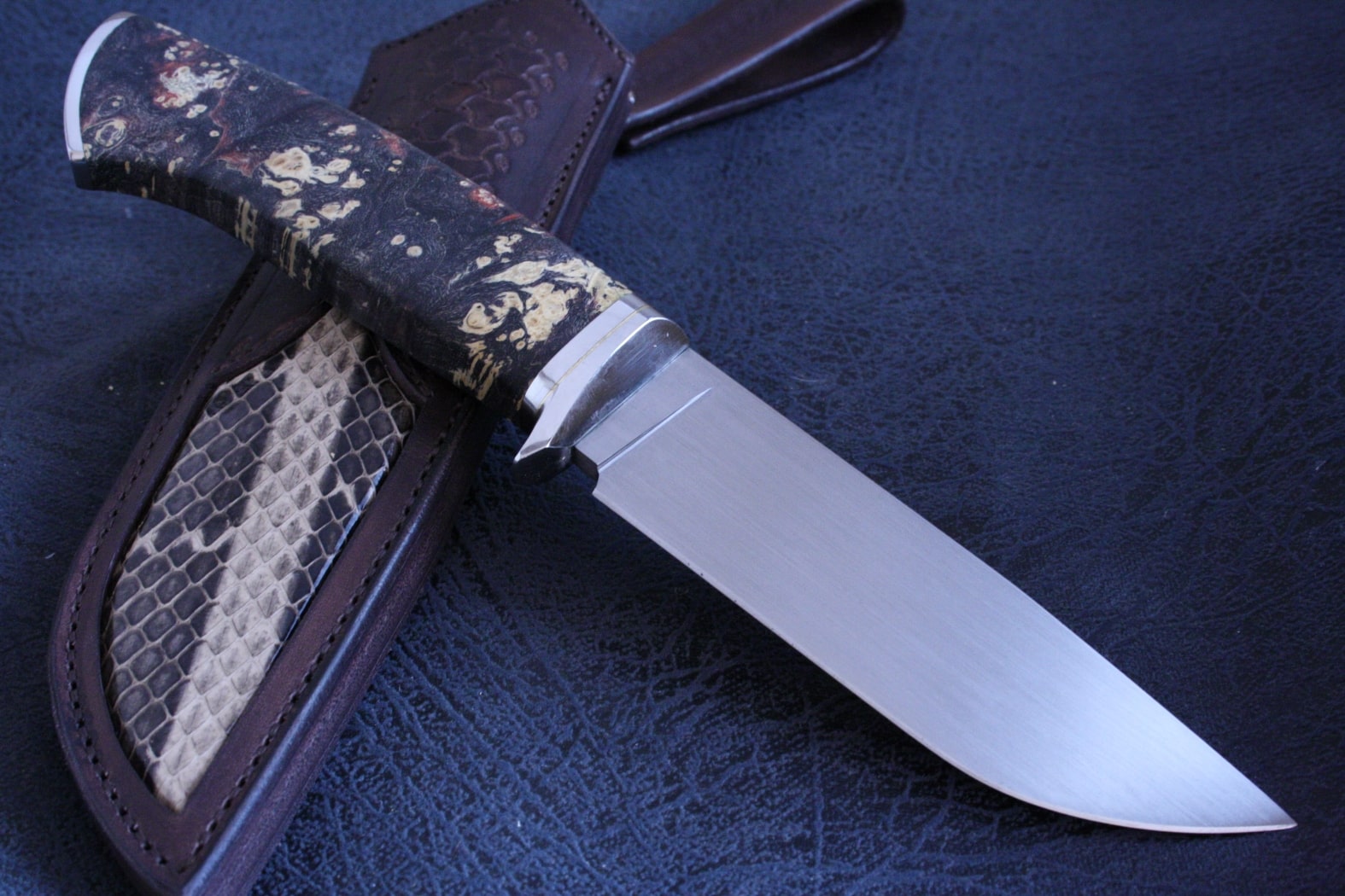 Vegetable tanned leather sheath with python skin inlay